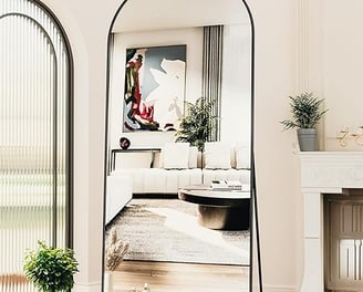 The Antok Arched Full Length Mirror is a stylish and versatile addition to any home. Measuring 76"x34", it offers a full-length view and features an elegant arched top with a thin, lightweight aluminum alloy frame. Designed with safety in mind, it includes explosion-proof glass. This mirror can be used freestanding with its U-shaped bracket or mounted on the wall, making it a perfect fit for both bedrooms and living rooms. Its combination of functionality and elegance enhances any space.